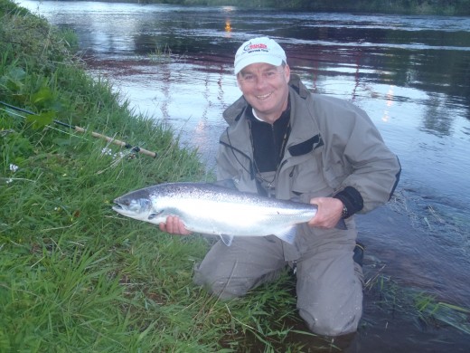 On Monday 13th May sport continued. Mike Palmer landed this 15lb salmon on the fly at Factory Wall and Sam Burgoyne (10lb) at the Top Pool which was released.