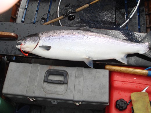 ‘Saturday 11th was quite windy, blowing south westerly, so I headed along the bank down as far as the pumping station, about turned back towards Balmaha for the third time and the poker rod let out a scream – fish on! After about 10 mins of getting tossed about the boat the fish broke the surface. A cracking 22lb Salmon came to the net, what a fight!’ Wee Geordie.